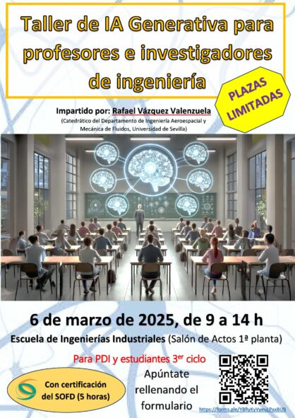 El Grupo de Innovación Docente en las Enseñanzas de Automática (IDEA), en el marco del actual proyecto de innovación concedido por el SOFD, ha organizado un taller de formación titulado «Taller de IA Generativa para profesores e investigadores de ingeniería», que será impartido por Rafael Vázquez Valenzuela (Catedrático del Departamento de Ingeniería Aeroespacial y Mecánica de Fluidos, Universidad de Sevilla) el día 6 de marzo de 2025, de 9 a 14 h, en el Salón de Actos de la 1ª planta de la Escuela.